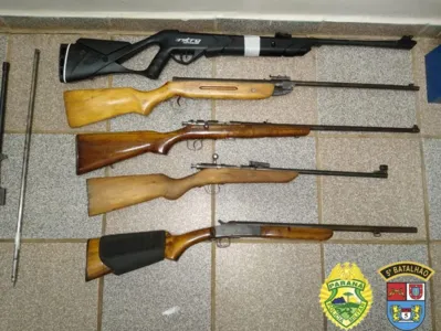 Durante as buscas, os policiais apreenderam 2 espingardas calibre 12; 4 espingardas calibre 22; 1 espingarda calibre 32; 1 espingarda calibre 36; 2 espingardas de chumbinho; 4 revólveres (1 cal. 32, 1 cal. 22 e 2 cal.38); 3 pistolas calibre 380; e munições de diversos calibres.