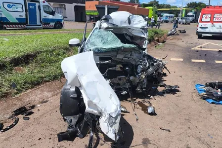 O carro ficou completamente destruído com o impacto. A carreta foi jogada para o acostamento da rodovia.
