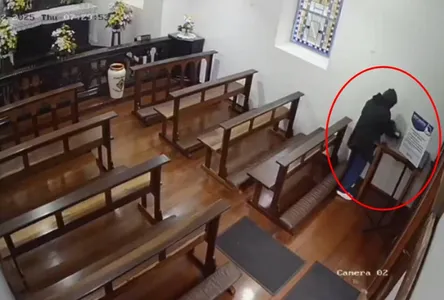 Imagens da câmera de segurança mostram o suspeito usando uma cadeira para alcançar o altar. Vestindo blusa preta, calça azul e tênis branco, ele utilizou uma capa de chuva amarela para embrulhar os objetos sagrados antes de fugir do local.