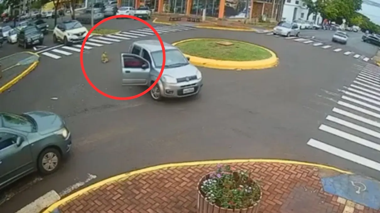 As imagens mostram um Fiat Uno prata fazendo a rotatória em baixa velocidade, quando a porta do passageiro, ao lado do motorista, se abre e a criança cai no asfalto. A motorista do veículo desce rapidamente e pega a criança, retornando com ela para o veículo.