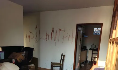 "Muito sangue espalhado pelo chão. O indivíduo teve a capacidade de usar o sangue para escrever a palavra 'pilantra' na parede, uma cena aterradora, visto que o casal tem uma criança", descreveu o policial.