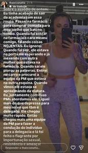 "Eu tinha acabado de sair da academia com essa roupa. Passei na farmácia para comprar pomada para meu joelho que bati no tombo. Quando fui entrar na farmácia o cara mexeu comigo, falando coisas NOJENTAS. Eu ignorei. Quando fui sair, ele estava na porta me esperando e já mexendo com outra mulher que estava na farmácia. Quando saí ele piorou as palavras. Entrei no carro e procurei a equipe da PM que estava na outra esquina. Quando vimos ele estava se aproximando da viatura. Eu, juntamente com duas PMs abordamos ele. Liguei mais do que depressa para meu noivo que também é delegado. Ele chegou muito rápido. Então chegou mais uma equipe da PM para fazer a condução do indivíduo para a delegacia e lá foi feito o flagrante por importunação sexual, resistência e ameaça!"