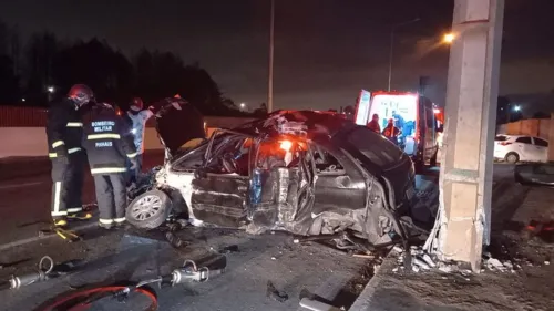 De acordo com os bombeiros, o carro bateu em uma mureta de proteção e, em seguida, em um poste. O acidente aconteceu neste sábado (24).