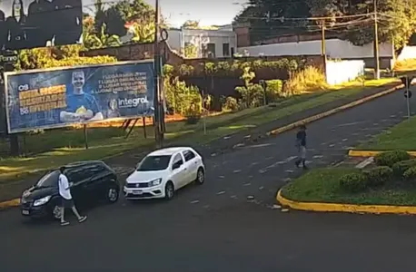Pouco tempo depois, câmeras de monitoramento flagraram o momento em que o indivíduo perdeu o controle do carro e colidiu com um veículo que estava parado aguardando a entrada em uma rotatória. Após a batida, o homem abandonou o automóvel no local e continuou a fuga a pé em direção a uma mata próxima.