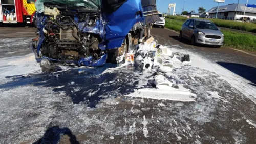 Um dos veículos estava carregado com latas de tinta. Ainda conforme a equipe, o caminhão que retornava foi encontrado estacionado em posto de combustível próximo ao local, seu condutor não foi localizado. A PRF confeccionará o boletim de acidente de trânsito.