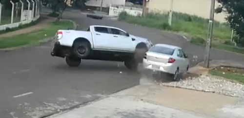No vídeo é possível ver a caminhonete atingindo um carro estacionado e em seguida capotando.