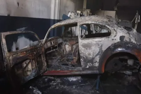 Os bombeiros precisaram abrir um buraco na porta da oficina para ter acesso ao local. Eles apagaram o fogo que estava nos veículos e nos equipamentos e, em questão de minutos, conseguiram controlar as chamas.