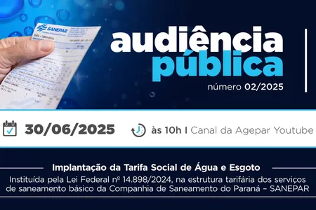 A Agência Reguladora de Serviços Públicos Delegados do Paraná (Agepar) realizará no dia 30 de junho, das 10h às 12h, audiência pública sobre a implantação da Tarifa Social de Saneamento Básico no Estado, prevista na Lei Federal nº 14.898/24. É uma oportunidade para a sociedade civil apresentar suas sugestões sobre o tema e participar mais ativamente. As inscrições começaram nesta segunda-feira (16).