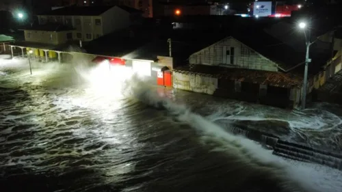 Além de cobrir a faixa de areia, a maré invadiu parte da calçada e bateu contra a parede de casas e comércios que ficam de frente para o mar.