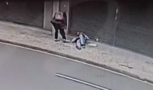 As imagens mostram uma pessoa não identificada se aproximando da vítima, que estava deitada na calçada, e fazendo um movimento próximo ao rosto dela. Em seguida, o homem começa a se agitar, como se tentasse retirar algo da região do rosto. Pouco depois, ele se levanta e é possível ver chamas na região do tórax.
