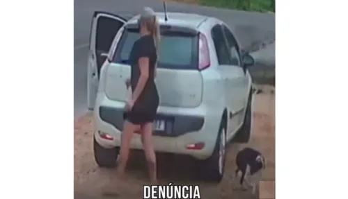 Nas imagens é possível ver quando a suspeita para o veículo, vai até o banco traseiro, tira o animal, volta para o carro e vai embora, deixando o cão sozinho.