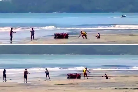 Logo que pisou na areia, porém, diz ela, seu pé afundou e ela caiu. Um rapaz a ajudou e orientou que ela pisasse apenas nas partes brancas, onde a areia havia secado. Em seguida, ela viu a outra mulher deitada, que parecia estar tomando banho de sol, pedindo ajuda e foi até ela.