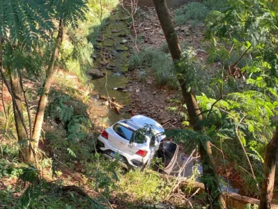 Por conta da colisão, a condutora do veículo atingido perdeu o controle e entrou em uma zona de mata, caindo no córrego.