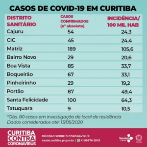 A Regional Matriz tem 189 infectados confirmados, o equivalente a 105, 6 casos por 100 mil moradores. Já Santa Felicidade, com 100 confirmados tem o equivalente a 64,3 casos para cada 100 mil moradores.