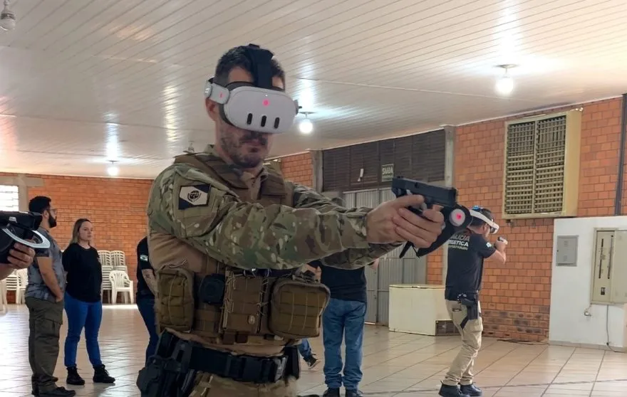 A Polícia Penal do Paraná (PPPR) participou, nesta quinta-feira (16), de uma capacitação tecnológica inédita em Toledo, no Oeste do Estado, focada no uso de realidade virtual para segurança pública. O treinamento reuniu policiais penais da região de Cascavel e outras forças de segurança para vivenciar simulações interativas de manejo de arma de fogo. Por meio de óculos de realidade virtual e sistemas avançados, os agentes foram inseridos em cenários que exigem tomada de decisão rápida e avaliação de risco, sem a exposição a perigos reais.