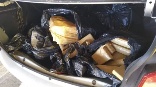 No interior do porta-malas do veículo foram encontrados 83,8 kg de maconha acondicionados em sacos de lixo.