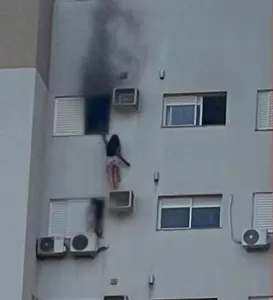 Vídeos divulgados nas redes sociais mostram a mulher pendurada na parte externa do prédio, fazendo o resgate. Depois disso, ela foi retirada pelos bombeiros pela janela do apartamento em chamas.