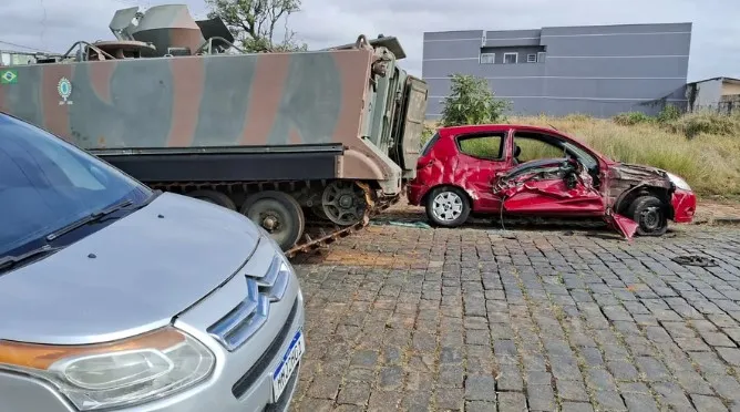 Uma viatura blindada do 25º Pelotão de Polícia do Exército acabou colidindo na lateral de dois veículos estacionados na rua Siqueira Campos, na região de Uvaranas, em Ponta Grossa. O acidente aconteceu por volta de meio-dia desta quinta-feira (03). Ninguém se feriu em decorrência do ocorrido.