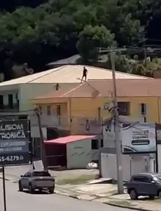 A tentativa de fuga e a consequente queda foram registradas em vídeo. As imagens mostram o momento exato em que o suspeito, já encurralado e com a presença de outra pessoa próxima ao local, tenta se movimentar pelo telhado, perde o equilíbrio, escorrega e despenca no chão.