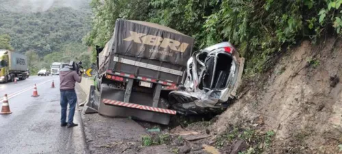 O automóvel foi prensado pelo caminhão contra o barranco, ficando completamente destruído