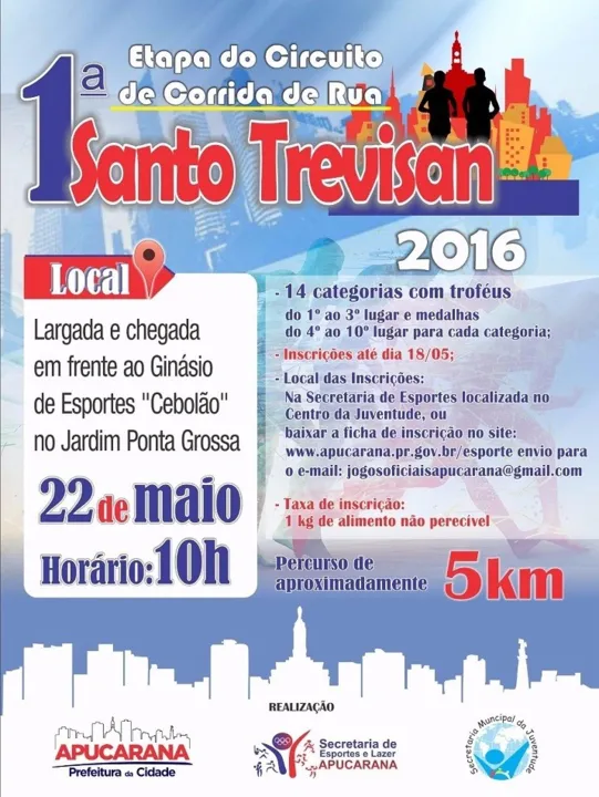 A Secretaria de Esportes e Lazer e a Secretaria da Juventude de Apucarana comunicam que já estão abertas as inscrições da 1ª etapa da edição 2016 do Circuito de Rua Santos Trevisan.