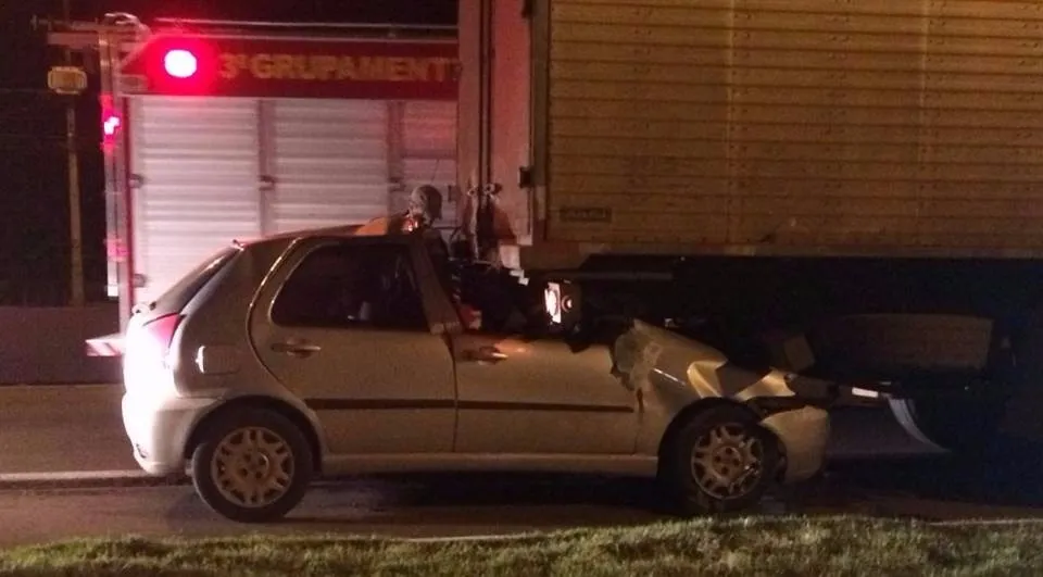 Um Fiat Palio se envolveu em acidente com um caminhão durante a madrugada desta sexta-feira (10) na PR-445, em trecho entre Londrina e Cambé.