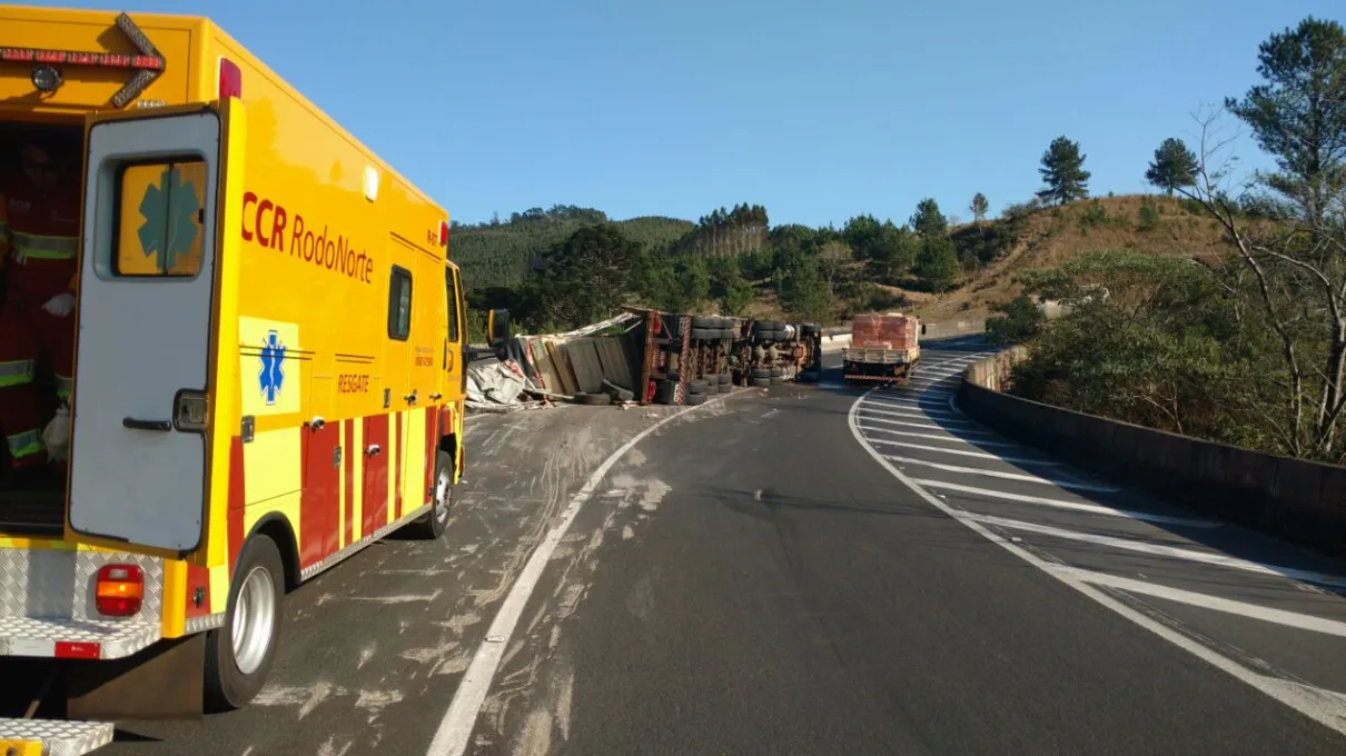 Um acidente de trânsito envolvendo um caminhão com placas de Maringá, foi registrado na manhã desta quarta-feira (28) na altura do Km 308 na Serra do Cadeado. A carreta carregada de chapa de MDF perdeu o controle e acabou tombando na pista.