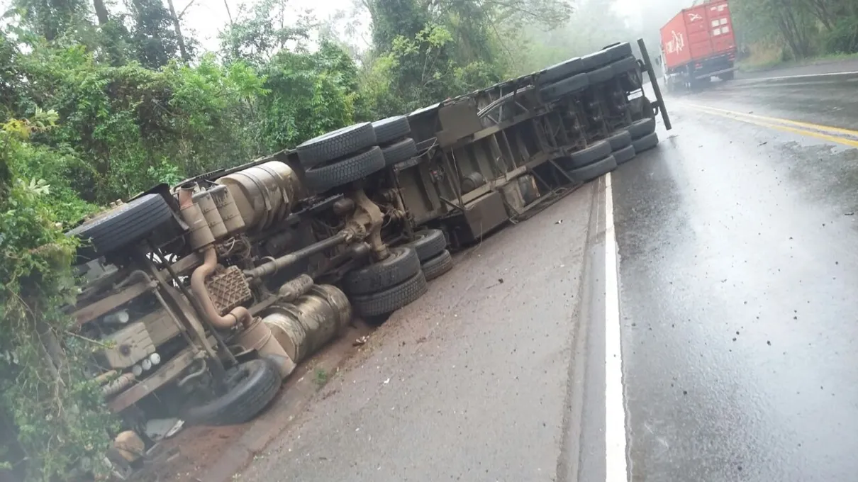 Um caminhão tombou nesta terça-feira (30/08), na PR-445, entre Mauá da Serra e Londrina. O veículo estava carregado com material reciclável. Após o acidente a carga ficou espalhada no acostamento da rodovia.