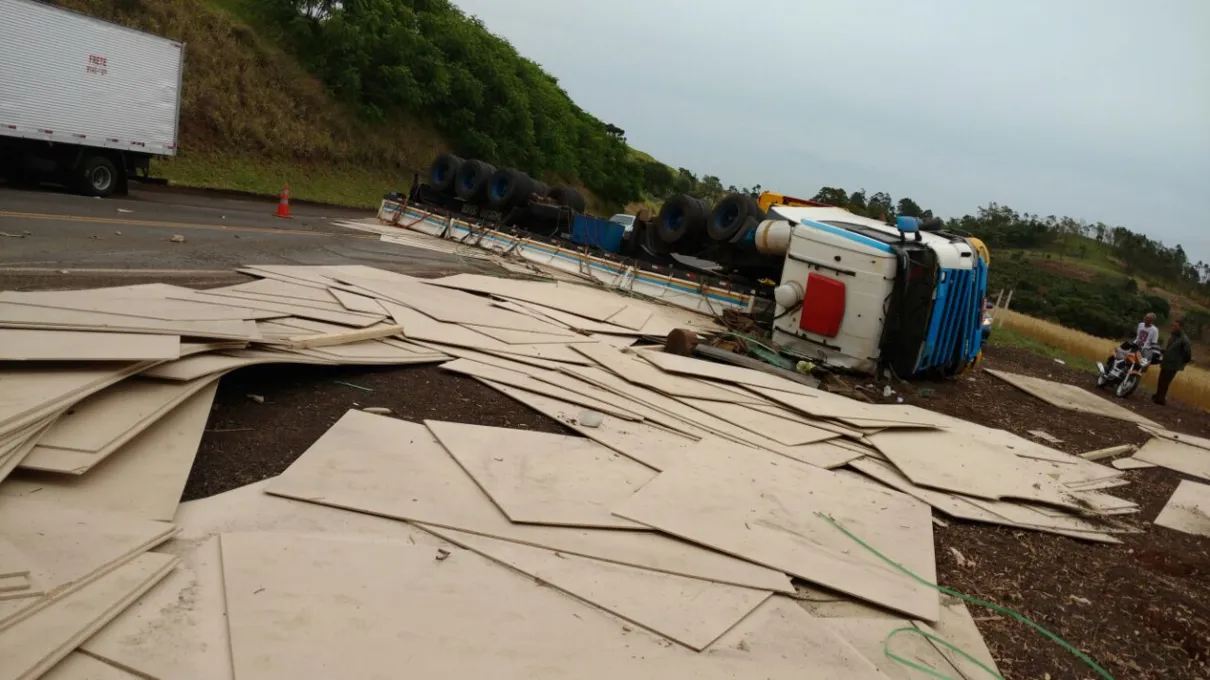 Um caminhão carregado com chapa de MDF tombou na manhã desta quarta-feira (05) na BR-376 entre Califórnia e Marilândia do Sul.