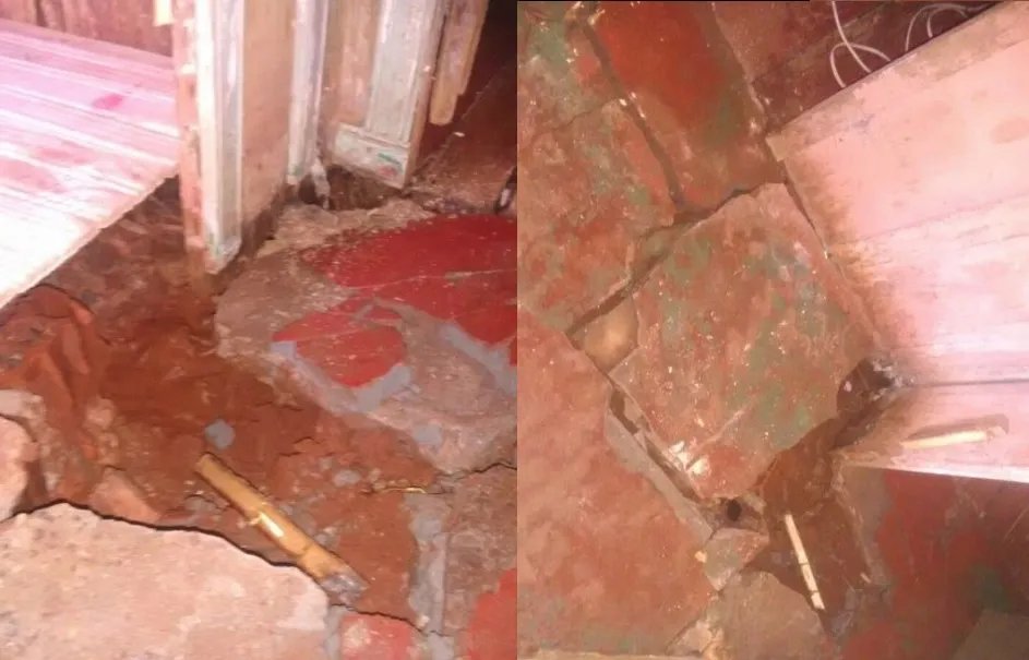 As chuvas destruíram a varanda que acabou cedendo trazendo danos em toda a residência que é de madeira. Um buraco se abriu no chão, rente à uma coluna que segura a estrutura da casa e que tem afundado cada vez mais.