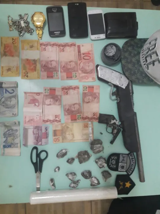 Durante vistoria, os policiais encontraram 47,7 gramas de maconha, celulares, mais de R$ 150 em notas trocadas e duas garruchas. Os objetos apreendidos foram encaminhados à delegacia.