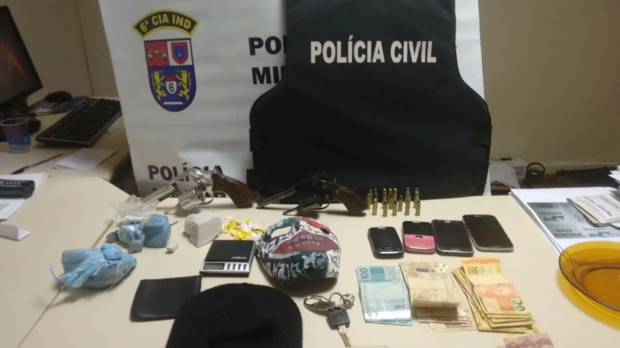 Na casa a polícia encontrou 103 gramas de crack, 6 gramas de cocaína, 313 gramas de maconha, quatro celulares, balança de precisão, dois revolveres de calibre 38 com 19 cartuchos intactos, uma touca do tipo bala clava e uma máscara, além de mais de R$ 2 mil em dinheiro. Durante a operação a PM também localizou um carro VW Fox que seria de um dos suspeitos. O veículo teria sido abandonado.
