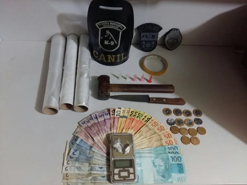 Com Cinthya Francisca Monteiro foram apreendidas duas buchas de maconha, na residência uma balança de precisão, embalagens vazias usadas pra venda de cocaína, objetos para a embalagem das drogas e uma grande quantidade em dinheiro trocado.