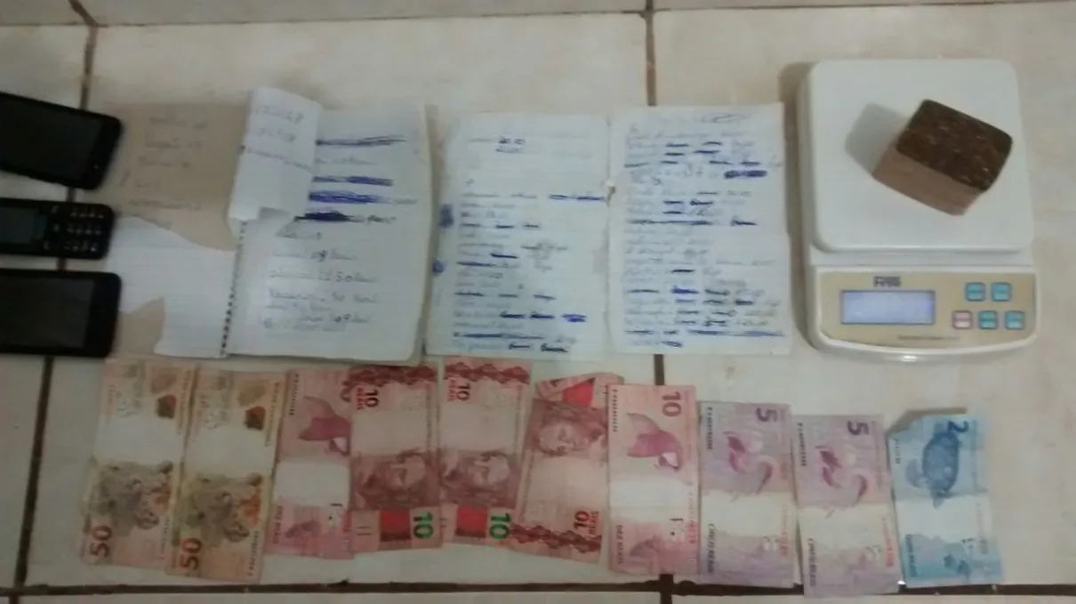 A Polícia Militar (PM) foi acionada pela Polícia Civil para dar apoio a ocorrência. Na casa do suspeito foram encontrados um tablete de maconha de 137 gramas, R$ 162 em dinheiro, três celulares, folhas de papéis com nomes de supostos usuários e respectivas dívidas. A polícia ainda encontrou um caderno de anotações com a contabilidade do comércio de drogas.