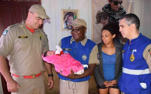 Bombeiros visitam bebê após parto no pátio da guarnição