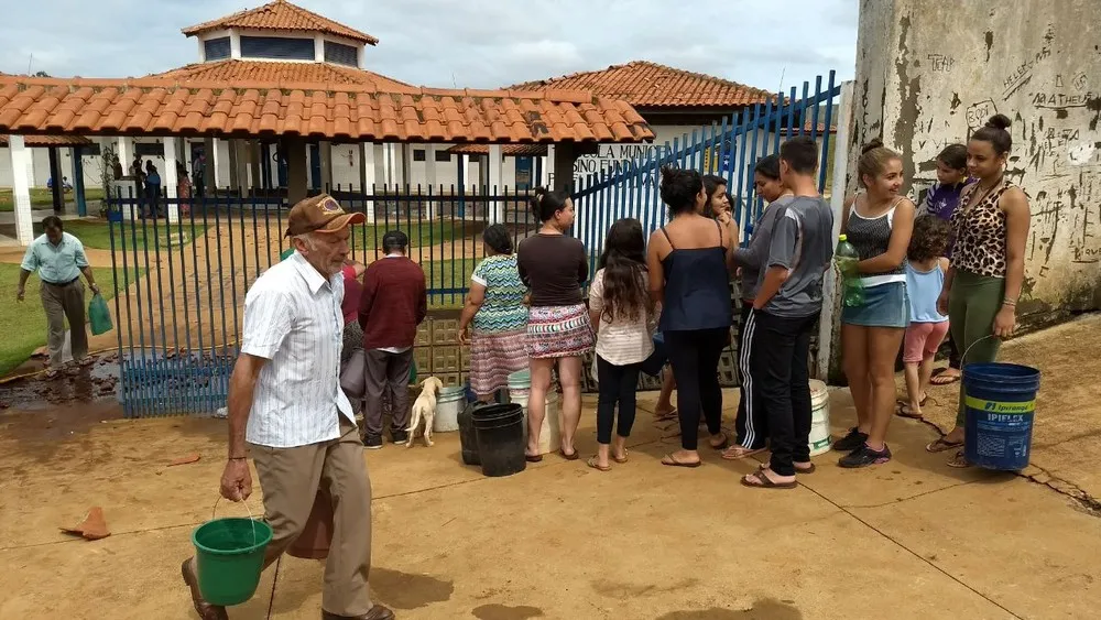 Na manhã deste domingo, moradores faziam fila para pegar água em uma escola.