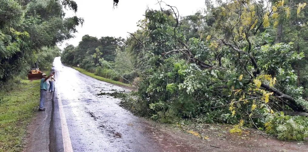 A forte chuva com ventos fortes derrubou uma árvore e um poste na madrugada desta quinta-feira (18), em trecho entre Bom Sucesso e São João do Ivaí.