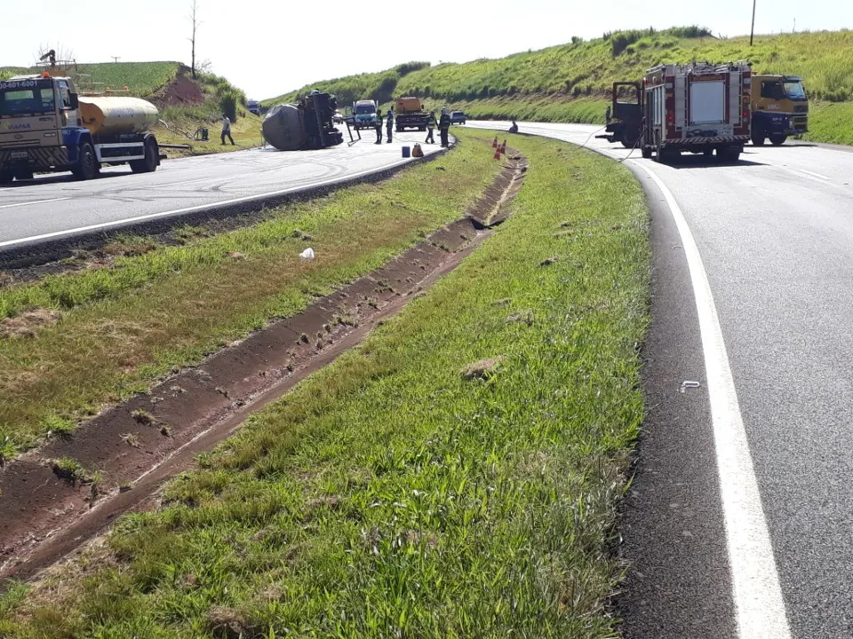 O combustível vazou por causa do acidente e provocou a interdição parcial da rodovia no tráfego sentido Arapongas.