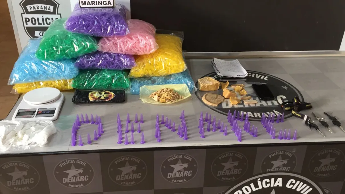 A Divisão Estadual de Narcóticos (Denarc) confirmou nesta quinta-feira (8) a prisão de um jovem, de 20 anos, suspeito de pelo abastecimento de drogas em Maringá. O investigado foi encontrado em sua residência, no bairro Bertioga, após o cumprimento de um mandado de busca e apreensão domiciliar. No local, a polícia apreendeu 480 gramas de crack e 215 gramas de cocaína, além de cerca de nove mil pinos plásticos – para a embalagem das drogas.
