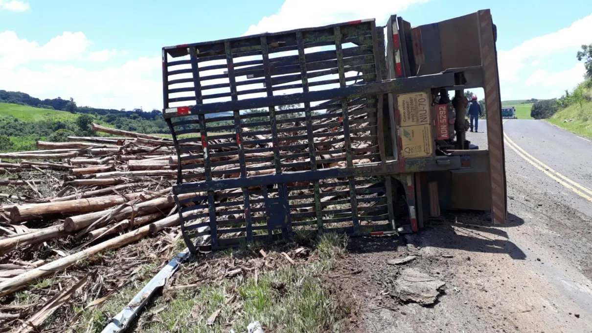 Caminhão carregado com toras de madeira tomba na PR-535