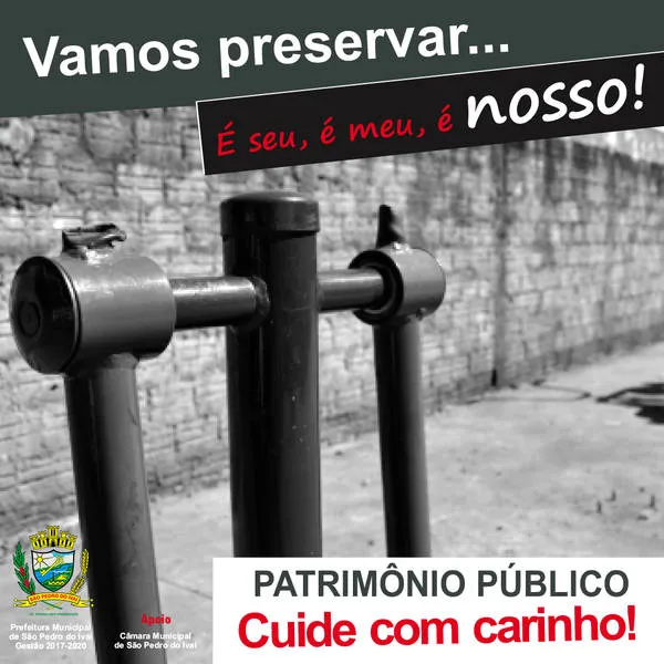 A prefeitura de São Pedro do Ivaí está lançando a campanha “Patrimônio Público: É meu, é seu...É NOSSO”, com foco na conscientização da população sobre a importância de cuidar dos prédios públicos, praças, escolas municipais, ATI’S e até árvores.