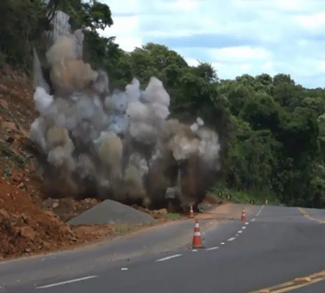 As detonações de rochas, realizadas em boa parte das frentes de trabalho da duplicação na BR 376, são necessárias para dar continuidade aos trabalhos de duplicação na Rodovia do Café.