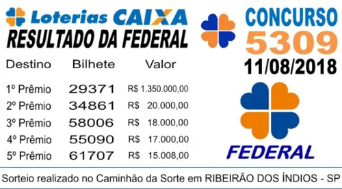 Um apostador de Rio Bom ganhou R$ 1 milhão e 350 mil reais no concurso 5309 da Loteria Federal, cujo sorteio foi realizado pela Caixa Econômica Federal (CEF) na noite de sábado (11).
