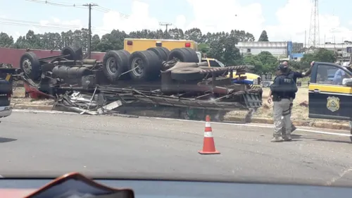 A Polícia Rodoviária Federal (PRF) ainda está no local e não divulgou a causa do tombamento do veículo, que estava carregado com placas de metal.