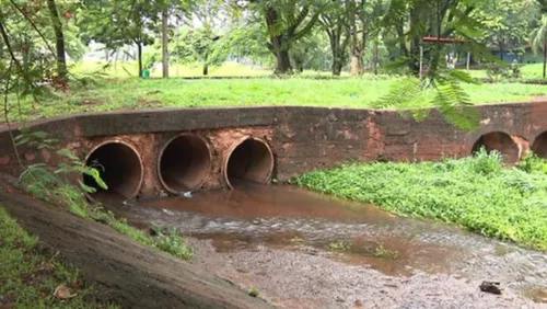 Após pular no córrego, que havia transbordado por causa da enxurrada, a vítima tenta se agarrar na margem, não consegue e é levado pela correnteza.