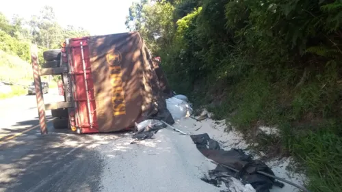 Uma carreta carregada com fertilizantes tombou na manhã desta terça-feira (22), no quilômetro 314 da BR-376, entre Mauá da Serra e Ortigueira.