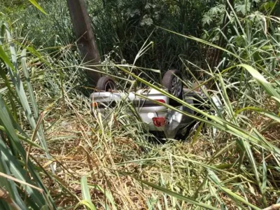 Um veículo Peugeot 207, com placas de São Pedro do Ivaí, acabou perdendo o controle e tombando.