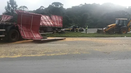 O motorista de um caminhão ficou ferido após um tombamento registrado na manhã desta terça-feira (11), na BR-376 em Tijucas do Sul, na Região Metropolitana de Curitiba. Por causa do acidente a pista chegou a ser interditado, formando aproximadamente 13 km de congestionamento sentindo Santa Catarina.