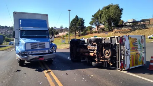 Um acidente envolvendo dois caminhões aconteceu na manhã de hoje (5) na entrada de Jandaia do Sul. Uma mulher ficou ferida. Com a batida um dos veículos tombou.
