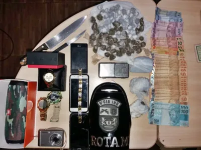 Em busca pessoal foi localizado com o adolescente, dois invólucros de maconha pesando 83 gramas. No quintal foi encontrado mais 106 invólucros com aproximadamente 107 gramas. No interior da residência, os militares encontraram mais 57 gramas da droga, uma balança de precisão, duas facas com resquícios de maconha e quase R$ 1.2 mil em células diversas, assim como vários objetos de origem duvidosa, relógios e celulares.